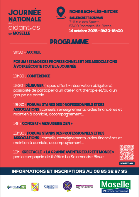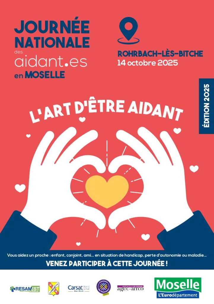 Le Resamest (Réseau de Santé de Moselle Est), en collaboration avec le CCAS de Rohrbach-Les-Bitche, la Commission des Financeurs du Département de la Moselle la CARSAT Alsace Moselle et l’Agirc-Arrco, vous convient à la Journée nationale des aidant.es organisée gratuitement :